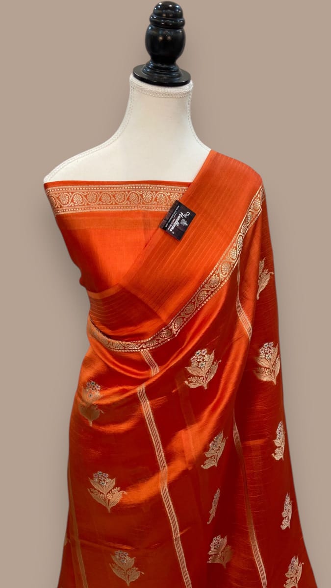 Elegant Banarasi Dyble Raw Mango Soft Silk Saree featuring intricate allover zari stripe butta with a satin finish border. The rich zari pallu adds a royal touch, paired with a plain blouse accented with a matching border. Ideal for weddings, festive occasions, or parties, this saree offers a perfect blend of tradition and sophistication.