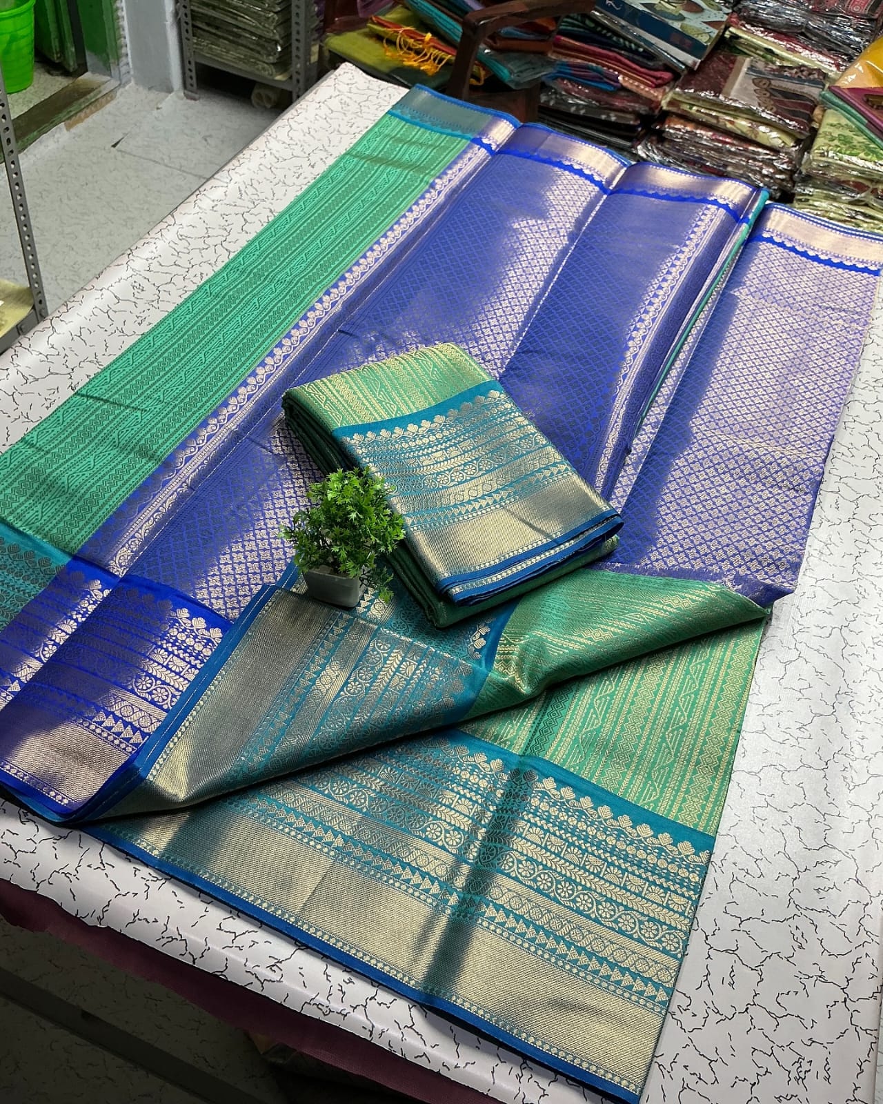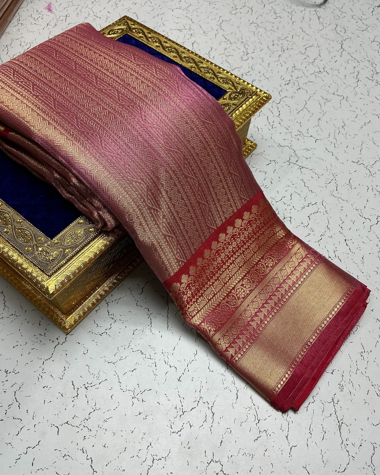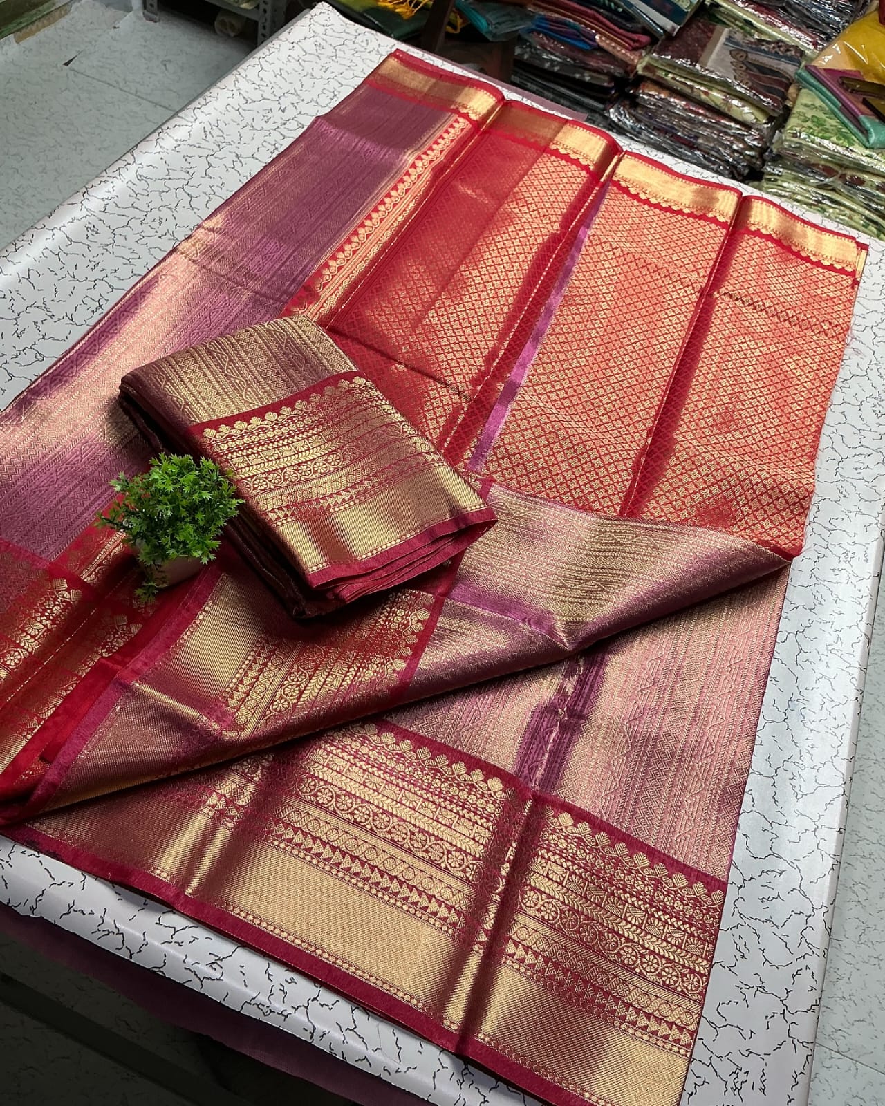 Upgrade your festive look with this soft tissue silk Banarasi saree, beautifully designed with allover weaving zari work, a rich zari border, and a grand weaving pallu. Comes with a brocade blouse to complete your elegant traditional style.
