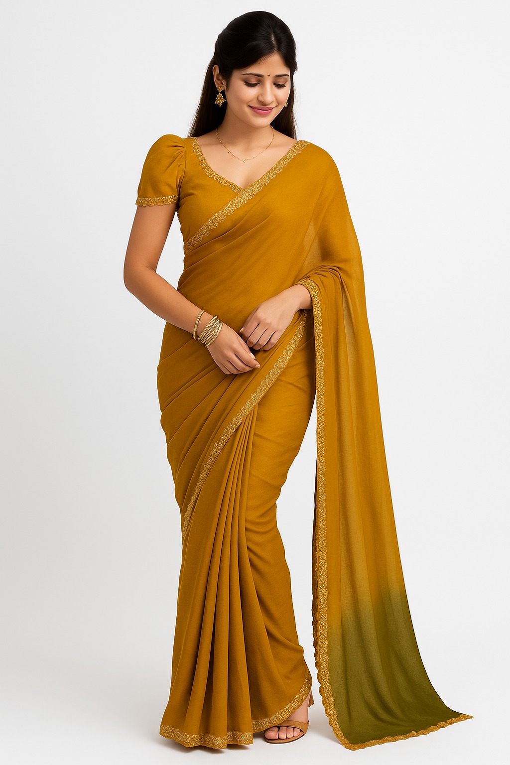 “Effortless elegance! Flaunt this mustard-gold chiffon saree with handwork lace for a chic and classy festive look.”