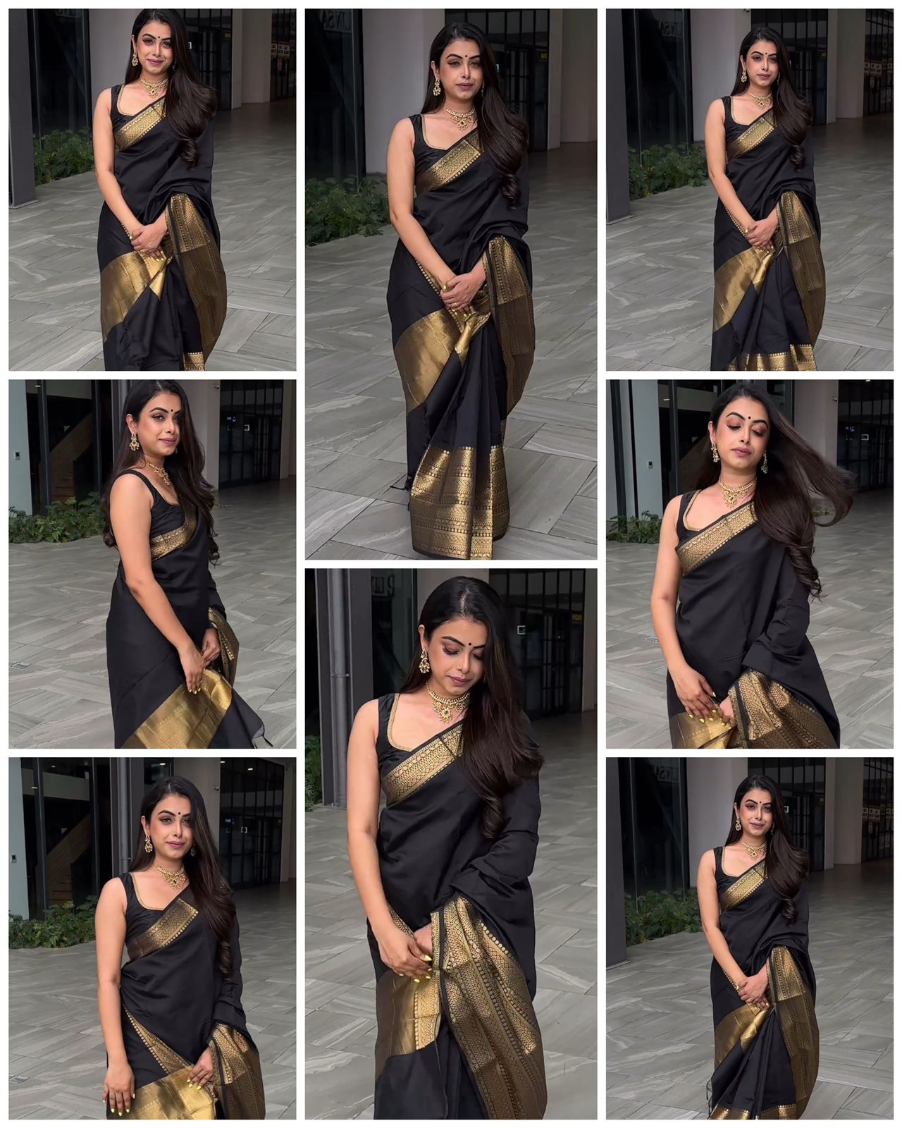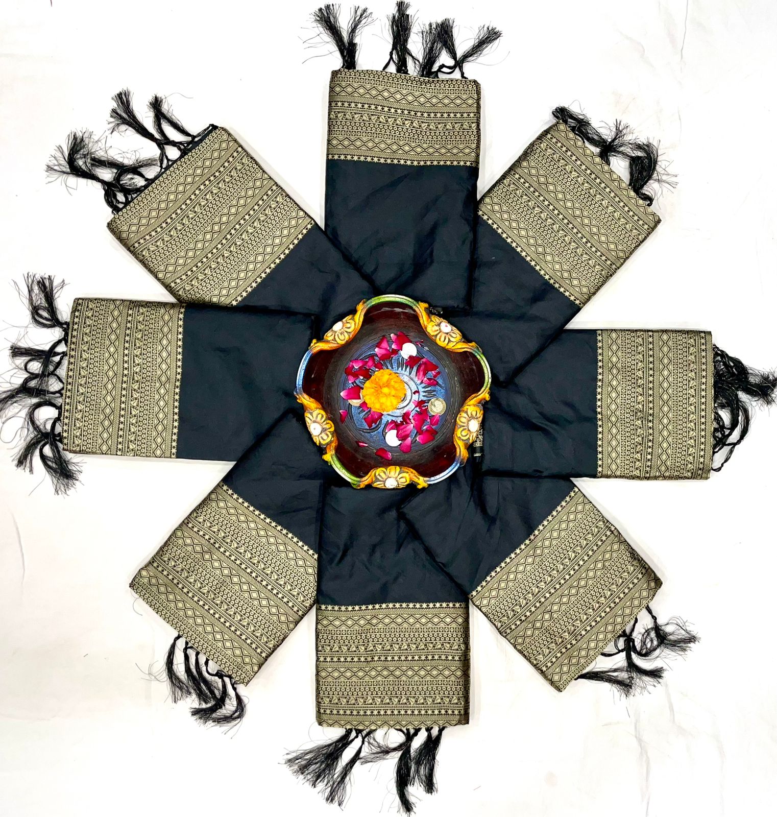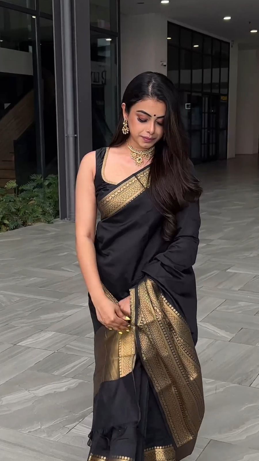 - The saree features a rich contrast of deep black silk fabric complemented by intricate golden border work that adds a touch of grandeur. The wide zari border showcases traditional geometric patterns and motifs, making it perfect for special occasions and festivities. The pallu features elaborate golden work that cascades beautifully, while the matching black blouse piece completes the ensemble. The premium silk fabric ensures comfortable draping and a graceful fall that enhances the wearer’s silhouette. This timeless piece combines classic design elements with contemporary styling, suitable for both formal events and cultural celebrations. The contrasting combination of black and gold makes this saree a versatile addition to any ethnic wardrobe.