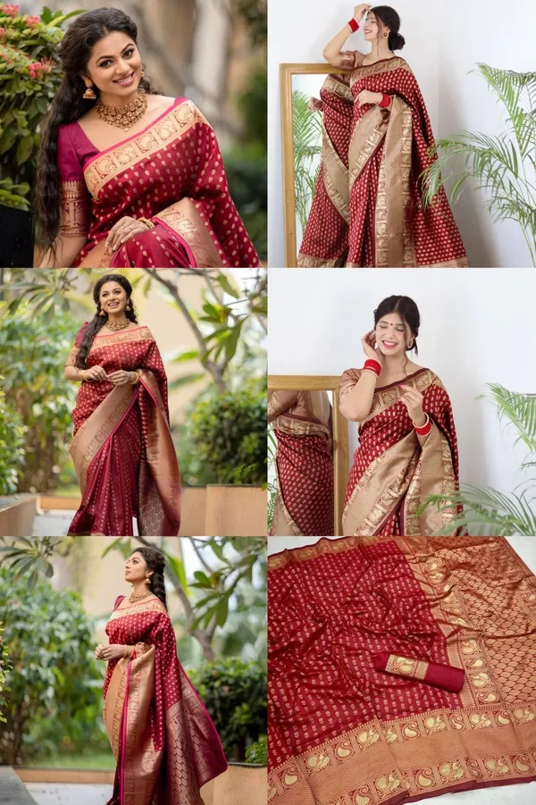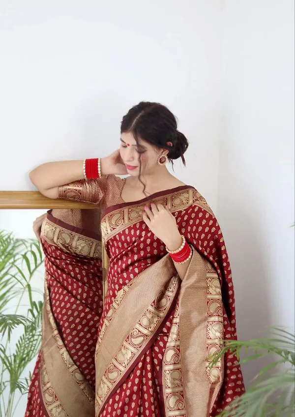 Maroon Soft Litchi Silk Butti Work Banarasi Saree With Unstitched Blouse Piece | For Women