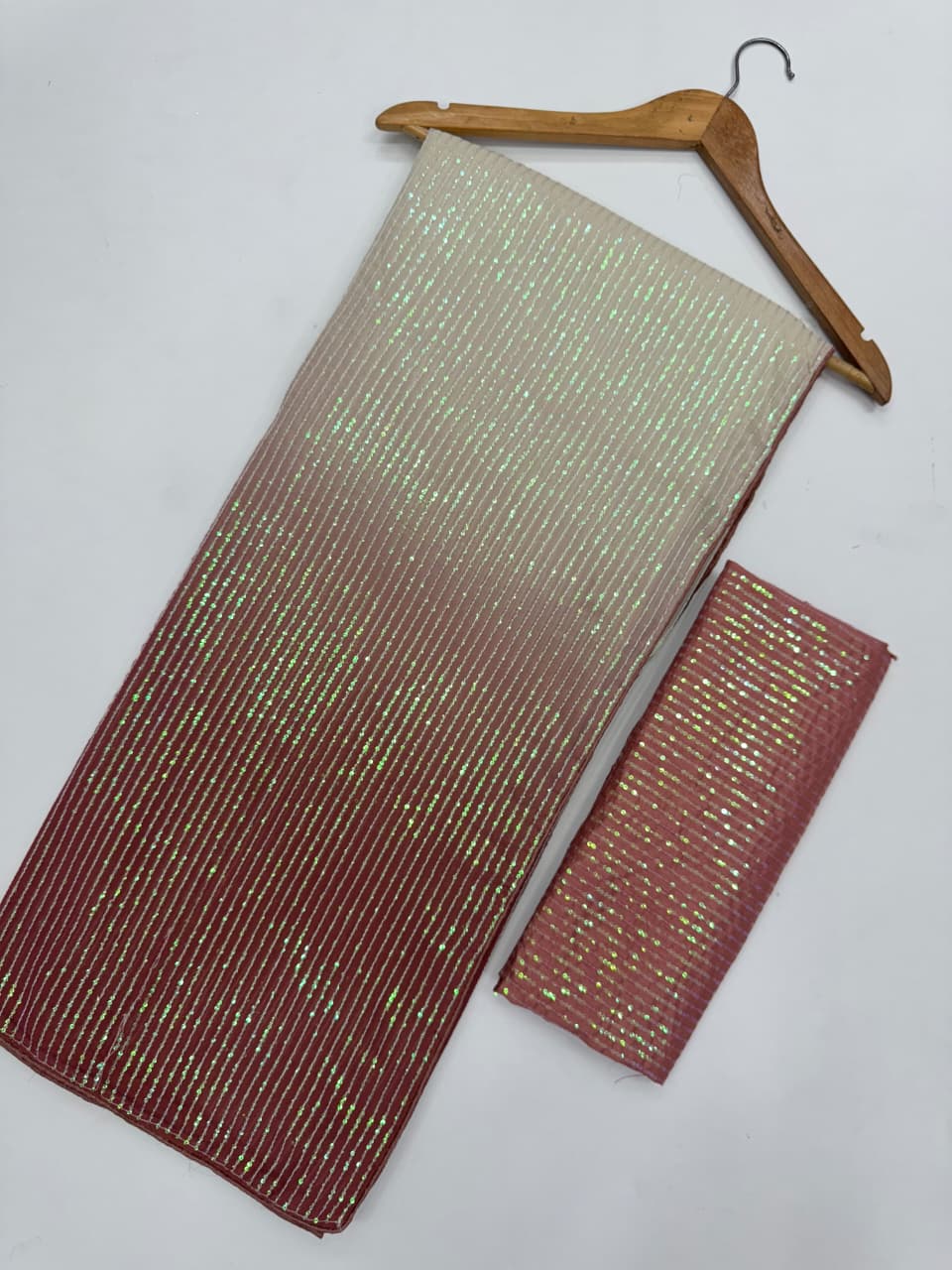 Trendy Bollywood-inspired ombre saree crafted in premium georgette with heavy 3MM rainbow sequin embroidery. Comes with a matching sequin blouse, perfect for party, wedding, or festive occasions.